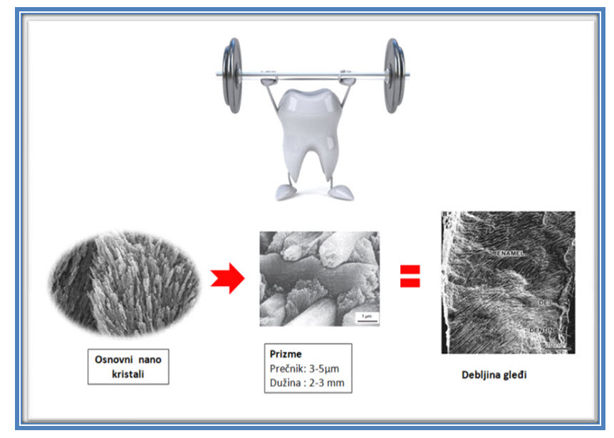 U gleđi zuba kristali su sabijeni u vrpce prizmatične strukture (gleđne prizme) koje se pružaju njenom celom debljinom (Slika 2). Osnovna jedinica hidroksilapatite su kristali nano veličine (manje od 100 nm) i one se neprekidno ugrađuju (remineralizacija) i izvlače (demineralizacija) iz gleđnih prizmi. Prema tome, pre nego što se ugrade minerali (kalcijum, fosfati i dr.) u gleđne prizme, oni iz nekristalnog (tzv, amorfni) oblika treba da formiraju kristale hidroksilapatita. Detaljnije