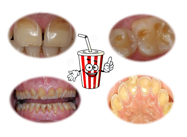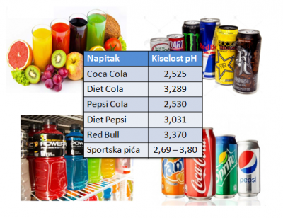 Najznačajniji uzrok erozija iz hrane su svakako napitci(Slika 2.), čija se potrošnja enormno povećava iz godine u godinu. Na prvom mestu su svakako gazirani, energetski i sportski napitci, ali i voćni sokovi, pa i voćni čajevi, pojedine mineralne vode, čak i vino i pivo. Većina njih kao dodatak sadrže limunsku kiselinu(E 330), forsfornu kiselinu(E 338), ugljovodoničnu kiselinu(E 290) pa i druge koje obaraju pH čak i ispod 4 pa i niže. Na primer pH kod Coca Cole je između 2-3, a Red Bulla 3,3. Detaljnije