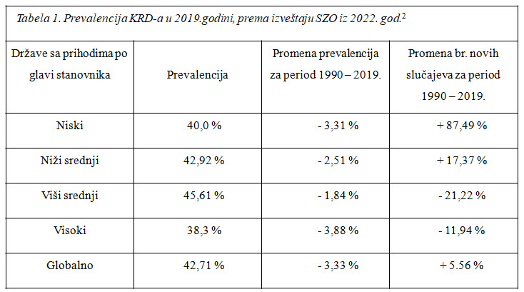 Najnoviji izveštaj SZO, objavljen u jesen 2022. god. (posle izlaska prvog dela ove edicije o KRD-a) ponovo ističe karijes kao vodeće oboljenje čovečanstva, a njegovu pojavu u mlečnoj denticiji kao temelj budućeg narušavanja oralnog zdravlja i najveći javno – zdravstveni problem u stomatologiji. Prema tom izveštaju globalna zastupljenost KRD-a 2019 god. iznosi 43%, a u 134 države od 194 članice SZO prevalenca je iznad 40%. Još uvek je najveća zastupljenost u zemljama sa višim srednjim prihodima po glavi stanovnika (prema klasifikaciji Svetske banke), a najniža u zemljama sa visokim prihodima (Tabela 1):