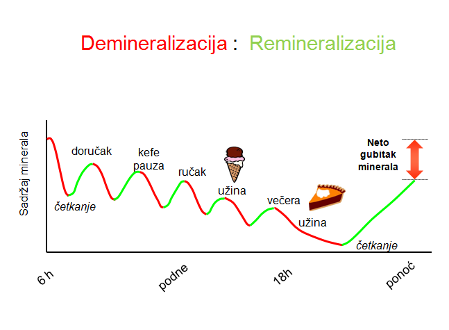 5. Ipak pored svih navedenih osobina, najvažniji momenat za razvoj zubnog kvara je učestalost unošenja kariogene hrane Kada slobodni šećeri dospeju u zubni plak, oni veoma brzo(za nekoliko minuta) dovode do obaranja pH ispod 5,5 što je granica za početak topljenja zubne gleđi(demineralizacija). Potrebno je oko 20 minuta da se kiselost neutrališe, a tek sa porastom pH započinje oporavak gleđi(vraćaju se minerali), što se naziva remineralizacija. Sa češćim unosom slobodnih šećera imamo više epozoda od po 20 minuta kada se izvlače minerali iz zuba, oporavak je manji nego gubitak i stepen njenog razaranje je veći.(Slika 2.).