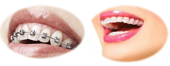 Слика 3. Фиксни ортодонтски апарати а) са металном бојом и б)провидним бравицама.