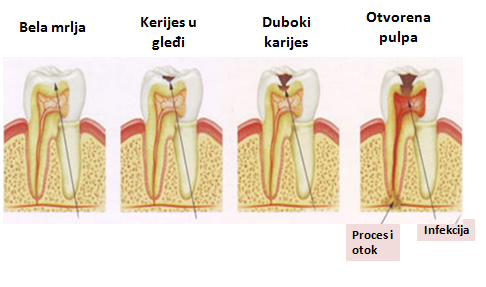 Uvek postoji mogućnost, ako je karijes već dosta pododmakao u dubinu zuba, da je unutrašnje meko tkivo sa krvnim sudovima i nervima(zubna pulpa, „živac“) već nepovratno inficirano i da će postepeno dolaziti do njegovog laganog izumiranja. To se ne oseća, ali se infekcija širi prema viličnoj kosti i stvara u njoj tzv. procese, koji može da s iznenadana aktivira i izazove bol i otok. Zato je neophodno povremeno proveravati stanje takvih zuba, što podrazumeva i rendgenske snimke. Detaljnije