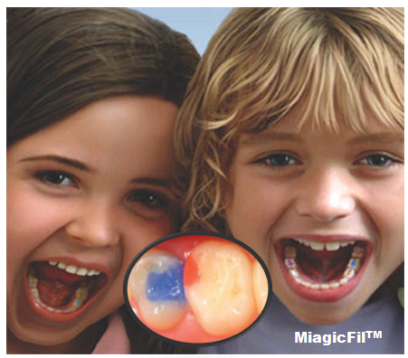 Sive plombe(izrađene od amalgama-legure srebra sa živom) su nekada jedino mogle da izdrže snažne pritiske(od više desetina kilograma) koji se ostvaruju prilikom žvakanja. Danas savremeni materijali koji zadovoljavaju i estetske karakteristike mogu da se postavljaju i na bočne zube. Kada je reć o maloj deci, problemi nastaju zbog otežanog rada i posebno mogućnosti da se obezbedi potpuna izlolacije od vlage na koju su bele plombe(materijal se naziva kompoziti) veoma osetljive. Posebna grupa materijala, koji se nazivaju glas-jonomer cementi više su prilagođeni uslovima rada sa malom decom, a imaju i dovoljnu otpornost. Pored toga oni otpuštaju fluoride koji direktno utiču na očvršćavanje(remineralizacija) okolnih tvrdih tkiva zuba(gleđ i dentin) oslabljenih tokomprocesa razvoja karijesa. Savremeni materijali za plombe mogu da budu i u boji, što je često zanimljivo i motivišuće za decu.(Slika 2. )