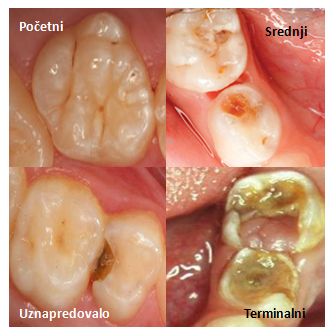 Slika 1. Različiti stadjumi razvoja karijesa na bočnim(kutnjaci) mlečnim zubima.