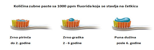 U ovim količinama(Slika 2.) smatra se da je rizik od razvoja fluoroze minimalan. Pri tome paste imaju efekta ako se zadrže na zubima najmanje 3 minuta. Preporuka je i da rizična deca ne ispiraju usta posle pranja. Detaljnije