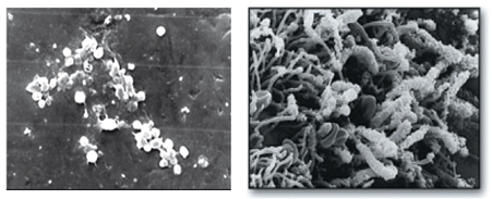 Slika 4. Odmah po čiščenju površine gleđi na njoj se pojavljuju bakterije (levo). Ukoliko se ne vrši njihovo uklanjanje i ukoliko imaju dovoljno ugljenih hidrata na raspolaganju posle nekoliko dana dolazi do njihovog sazrevanja(desno).