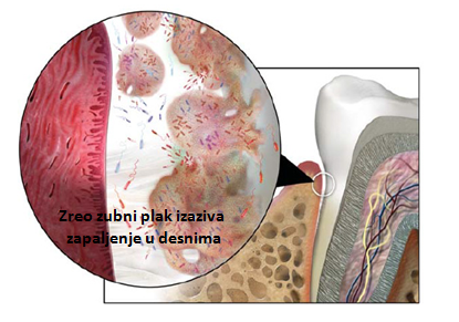 Slika 5. Zubni plak oko desni izaziva njihovo zapaljenje, razaranje kosti i omogućava prodor bakterija u krvotok.