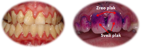 Slika 6. Zubni plak je vidljiv golim okom samo kada se nalazi u većim količinama. Sa posebnim sredstvima u obliku tebleta ili rastvora moguće je obeležiti i početne količine,pa čak i razlikovati početne od zrelih formi.