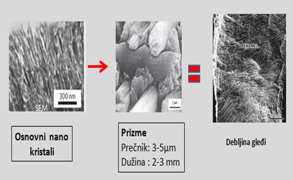 Zubna gleđ je najtvrđe tkivo u živome svetu. To joj obezbeđuje sastav koji preko 96% težinskog dela čine minerali, uglavnom kalcijum i fosfati. Minerali su prostorno raspoređeni u veoma složenu kristalnu strukturu koja se naziva hidroksil apatit. Sićušne iglice kristala(nano veličine) se međusobno sabijaju u cilindrične tvorevine koje se vijugavo pružaju kroz celu debljinu gleđi(nekoliko milimetara) i nazivaju se gleđne prizme. Takva sabijenost i usnopljenost značajno povećava mehaničku čvrstoću. (Slika 1.)