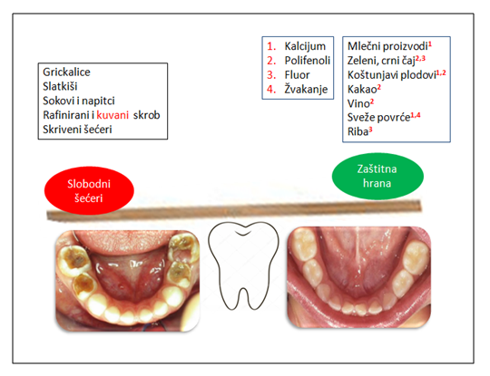Da bi se lakše i brže vršio oporavak oštećene kristalne rešetke, neophodno je da na površini zuba bude prisutno dovoljno minerala i da štetna hrana(videti detaljnije na kraju) ne ometa njihovu ugradnju. Savremena ishrana, bogata šečerima, i loša higijena to otežavaju.(Slika 3)