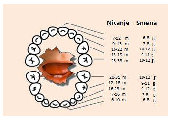 Prvi mlečni zubi se najčešće pojavljuju u periodu između 6 i 9 meseci. Njihova pojava pre četvrtog meseca se smatra preranim nicanjem, a posle godinu dana zakasnelim(potrebno je konsultovati dečjeg stomatologa). Pogledati redosled nicanja: