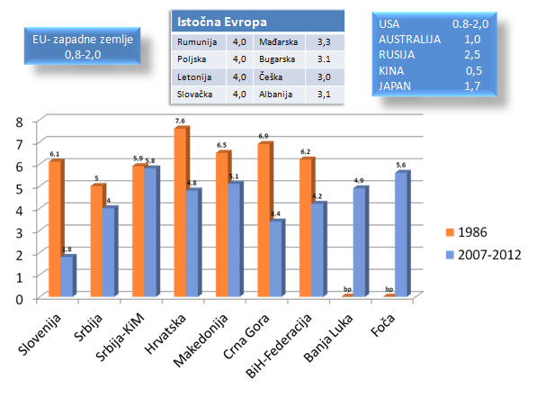 Veći više puta smo isticali kada je reč o zdravlju zuba da se nalazimo u donjem delu evropske liste. Dok je prosečan broj obolelih zuba po detetu uzrasta 12 godina u razvijenim zemljama ispod 2 (Slovenija npr. 1,8), u ostalim zemljama bivše SFRJ se kreće iznad 4 pa u nekim oblastima prelazi i 5. (Slika 1.) Detaljnije