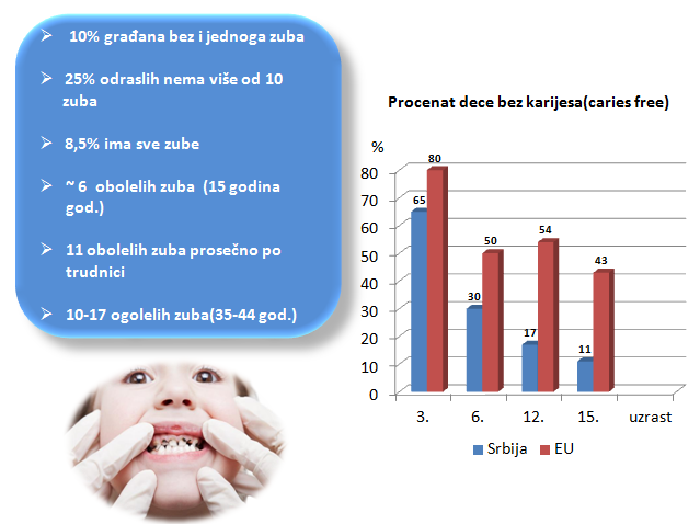 U svetu preko 60% dece u istom uzrastu(12 godina), nema ni jedan oboleo, plombiran ili izvađen stalni zub, dok je kod nas jedva preko 10%.Kada je reč o mlečnim zubima stanje je još više poržavajuće. (Slika 2.) Pri tome u Srbiji se nalazi šest stomatoloških fakulteta.Detaljnije