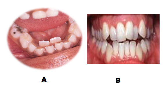 Nepravilno nicanje donjih stalnih sekutića je posledica velikih zuba i uskih vilica i znak su poremačaja u postavi zuba koji se naziva teskoba.(Slika 1B)