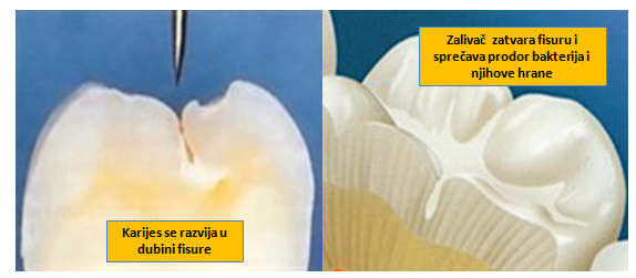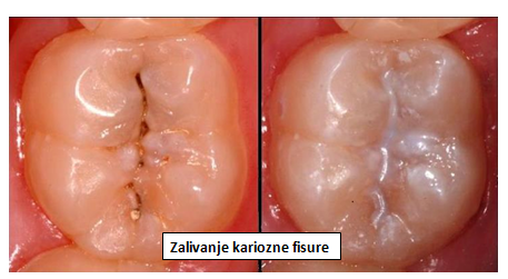 Razvoj karijesa u fisurama može da se spreči njihovim zalivanjem.(Slika 2). Smolasti materijal zatvara ulaz u fisuru, sprečava prodor bakterija i još važnije šećera (ugljenih hidrata) koji one koriste za ishranu usled čega se stvaraju kiseline. Kiseline razaraju zubna tkiva(gleđ i dentin). Pečaćenjem fisure se uništavaju i zaostale bakterije u noj. Danas se koriste materijali za zalivanje koji se i hemijski vezuju za površinu zuba i oslobađaju fluoride(glas jonomer cementi). Fluoridi pomažu da se izvrši vraćanje minerala (remineralizacija) u tkivo gleđi koje je oštećeno kiselinama iz zubnog plaka (demineralizacija). Pri tome se radi o minimalnim količinama fluorida sa isključivo lokalnim dejstvom bez unošenja u organizam.